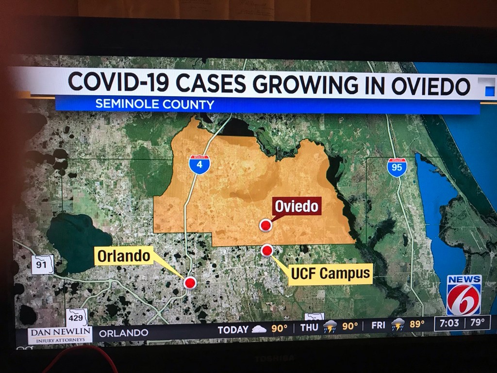 Tonight the news was about a hot spot here in Seminole County. The burg of Oviedo has seen huge increases in positives. Most of the new cases are among the traditional college aged. Oviedo is right next door to UCF. The demarcation between Seminole and Orange (home to UCF) Counties is a road called McCulloch. Literally, the East-bound lanes are in Orange while the west-bound ones are in Seminole. Those west-bound lanes mark the start of Oviedo. McCulloch marks the northern end of UCF property.
