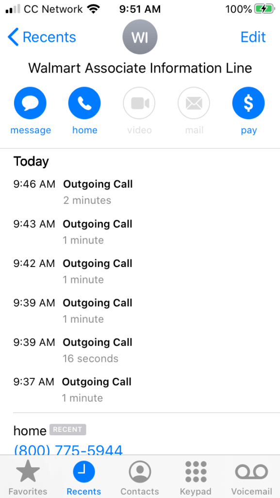 Walmart has a phone line we call to report in late or absent for that day or the following one or both. We call, tap in our WIN’s (Walmart Identification Number) and birthdates and the computer matches the information to our store. Then the happy (read: annoying) computer voice repeats the input and we hit 1 for correct or 2 for let me try that again.