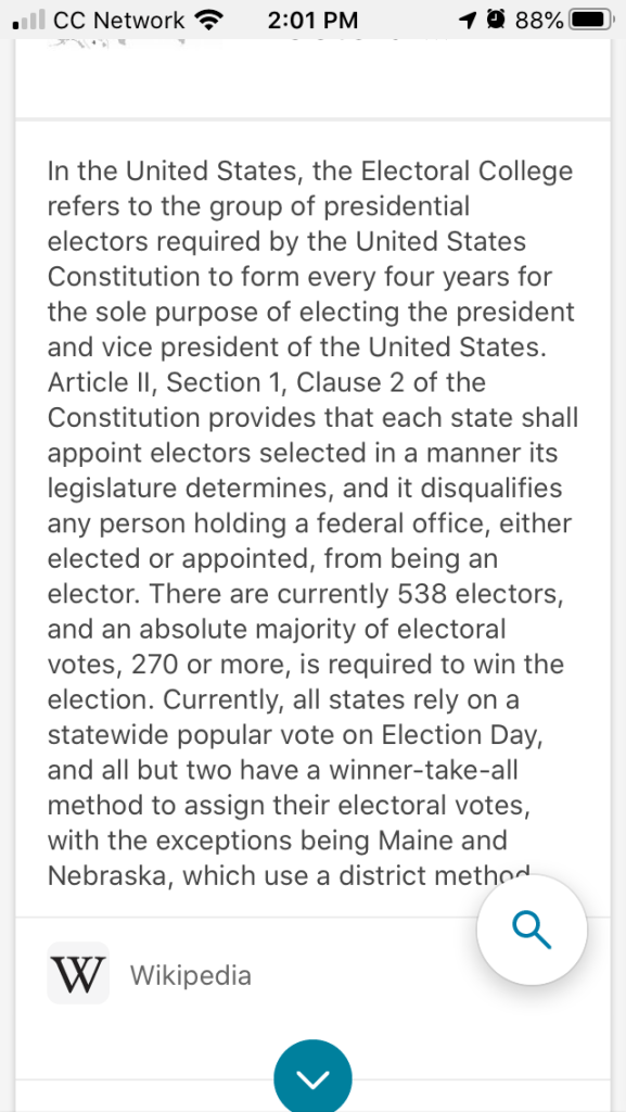 Many non-Americans don’t understand that the USA is not a direct democracy; it is a representative democracy. Electoral College electors are supposed to represent the will of the people. Since I am way too exhausted to translate some part of the US Constitution, I took a screenshot of a passage from Wikipedia. Yes, I know that source is not respected in academic circles but, there are times when they get things right. I think this is an example.
