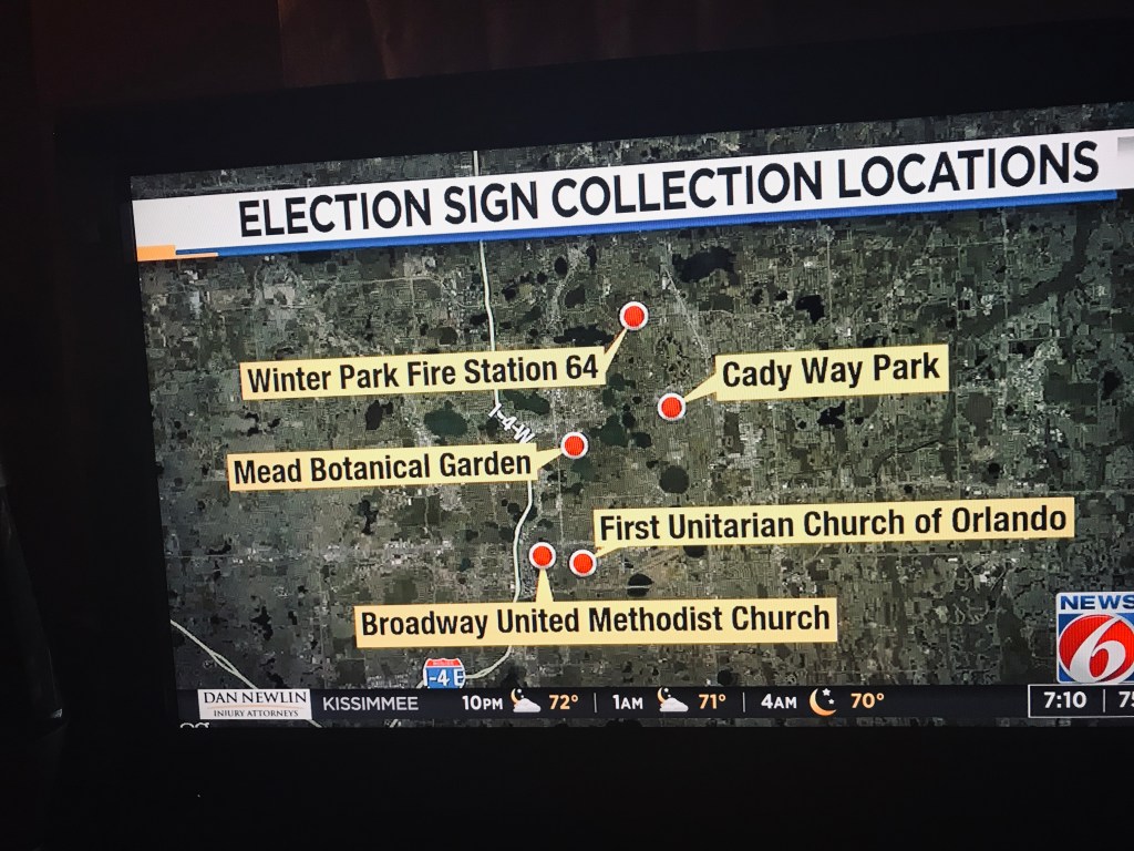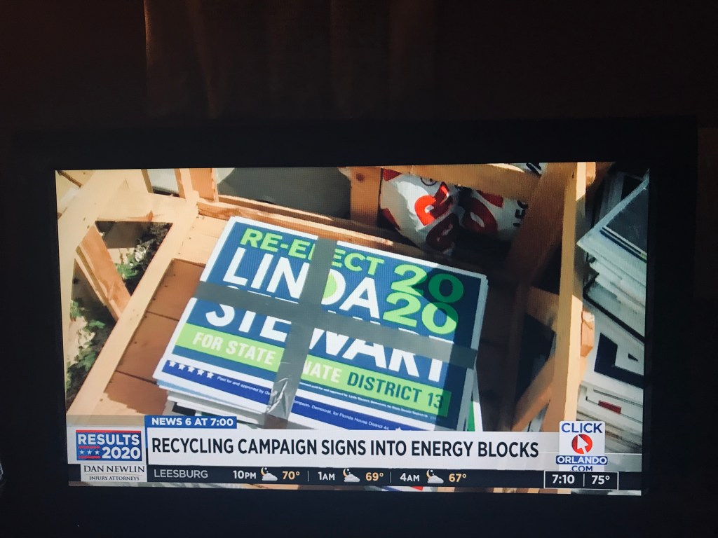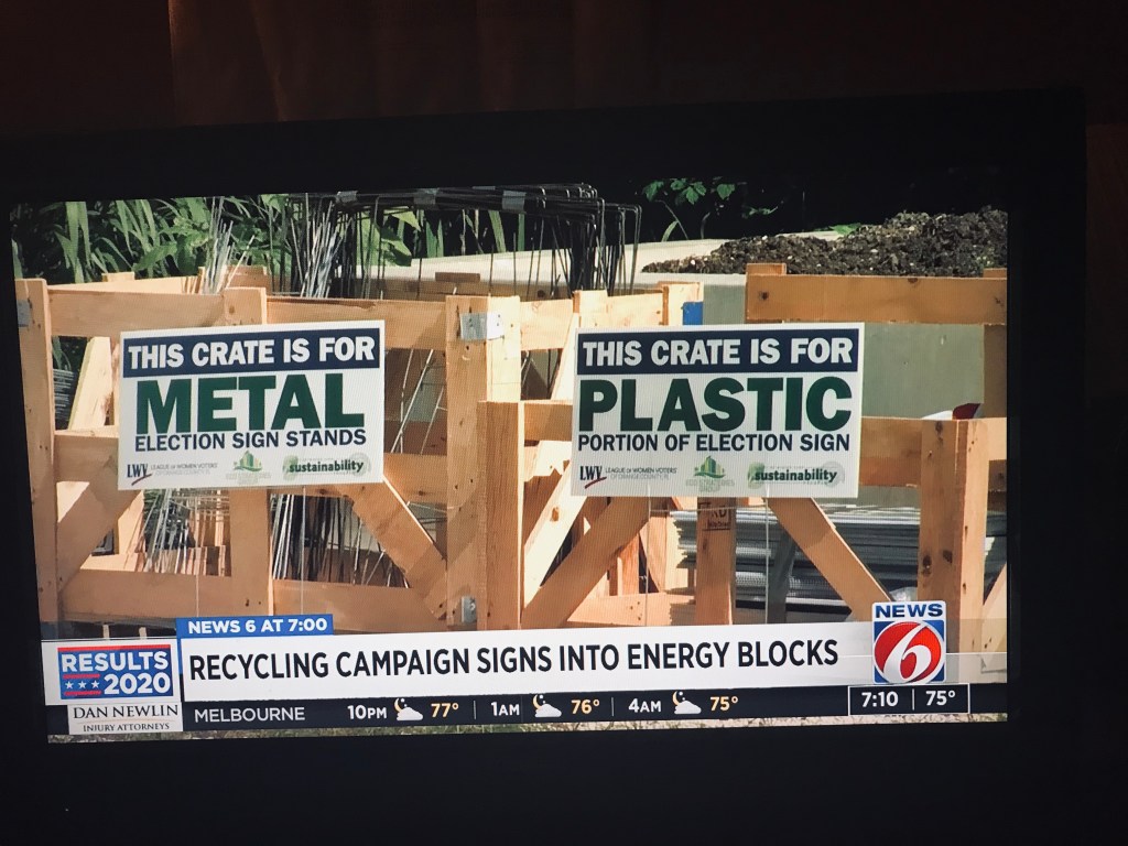 There are places in Orange County (Orlando metro) to take election yard signs for recycling. The sites are taking the metal sign supports and the plastic based signs themselves. They will be turned into an energy source. I need to track down more information. I just wanted to put the story out there so everyone could check to see if your own communities are doing something similar.