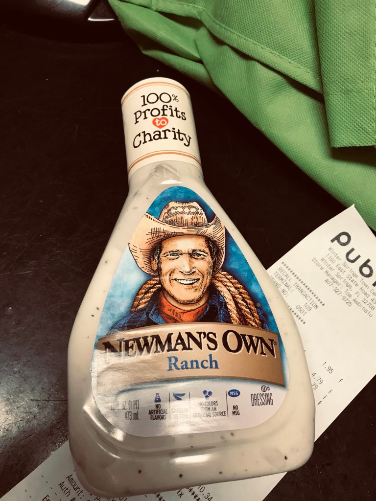 I headed to the cashier and started speaking to the young man (probably a UCF student) , “Hey, how are you? I bet I get out to my car and, shit, I did forget something. Can you suspend this? I’ll be right back.” “Sure, no problem.” I’d realized I forgot more blue cheese dressing. That’s kept over in Produce and I didn’t want to go so far. I compromised with ranch dressing. Newman’s Own was on sale. I like Paul Newman. He used to be hunky until he died. He was Aquarius so, I got to love him, right?