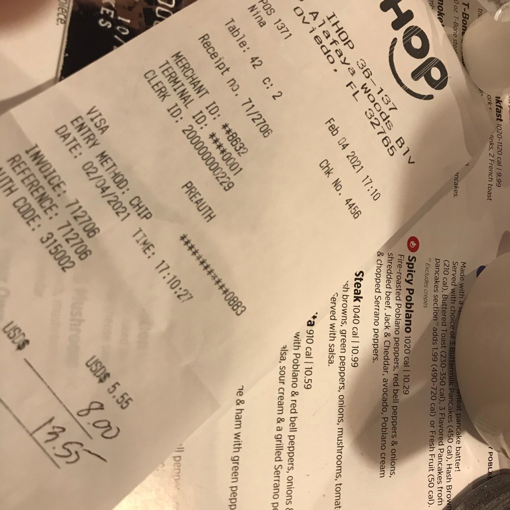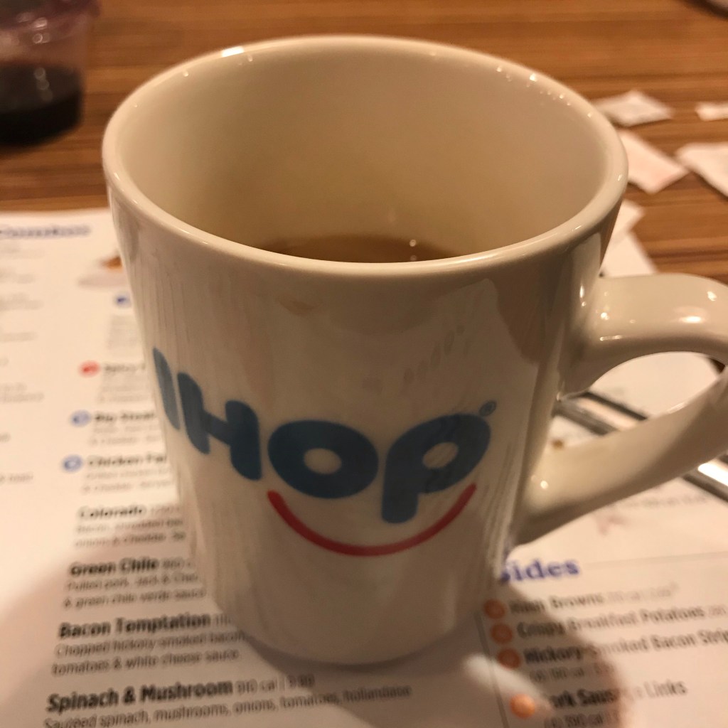 We are done chowing and are drinking our second cups of decaf. Note the price in the photo below. IHOP used to be famous for giving you a thermos of coffee with each order. Not now. I guess the thermoses are 86’d because of COVID. Five bucks for two coffees? I could have had a mocha at Charbucks. Rose paid for the food. I paid for the coffee so I could leave the tip.