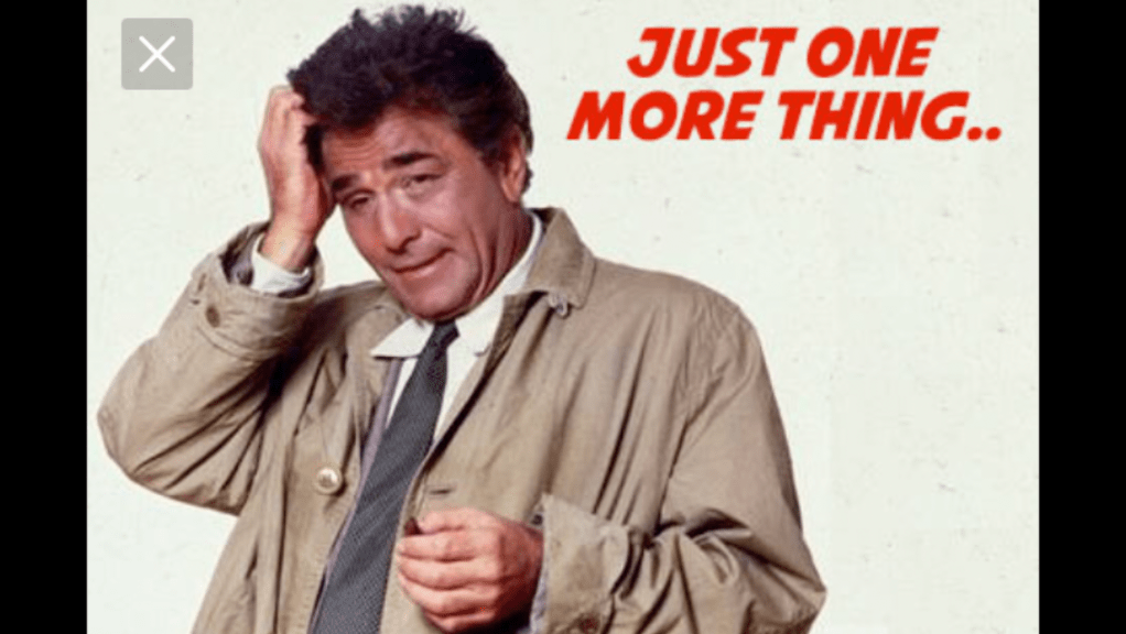 So, David Cassidy’s dad is playing the villain: a murderous magician who killed the guy who had dirt on him. Right now, Peter Falk’s Columbo is closing in on Jack Cassidy’s Great Santini. Columbo and his assistant are marveling over a Selectric typewriter. This is hilarious. Such simple times. I miss the music the most. That and not being 61.