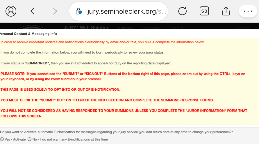 I got out my jury summons. Theoretically, the excusal request can be done online. Using my phone, I went to their website http://www.seminoleclerk.org and clicked on Jury Duty and saw the option of requesting an excusal or a postponment. I clicked on Jury Duty and found the print was so tiny on my phone I couldn’t read it and it wasn’t expandable. Geeze, I guess I am cranking up the computer.