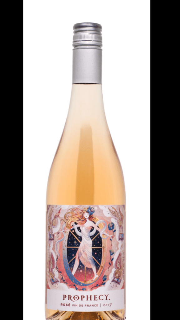 I picked up her bottle and it was from a winery I’d never heard of: Prophecy. Hers was a rose. The label caught my eye because the drawn figure was a young woman on a background that looked to be a giant wheel. It reminded me of the Wheel of Fortune Tarot combined with the World Tarot card, except that the female figure was clothed-in a long, flowing dress. Both of those cards are considered to be very positive.