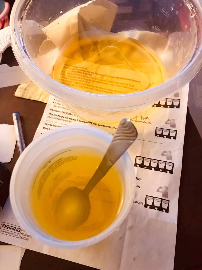 Between now and 10:40 am I have to drink at least three 8 ounce cups of clear fluid. I can’t have anything beyond that time, which is two hours before the colonoscopy.