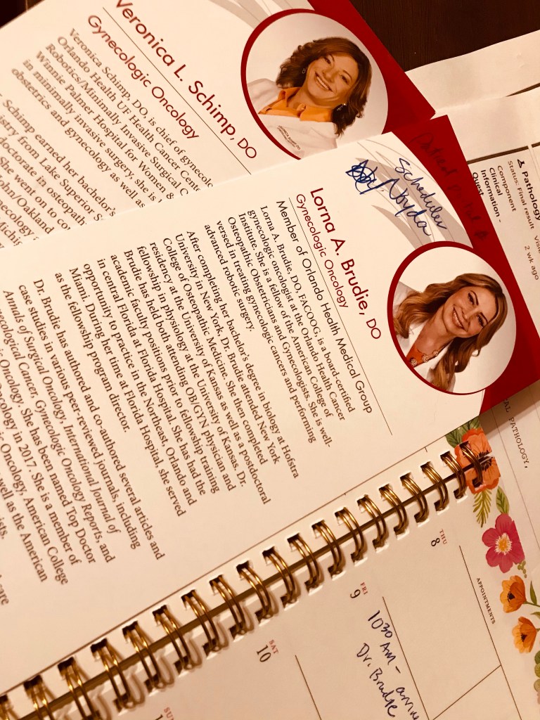 Dr. Bernal gave me info on two gynecological oncologists who are well regarded. They are both women DO’s.