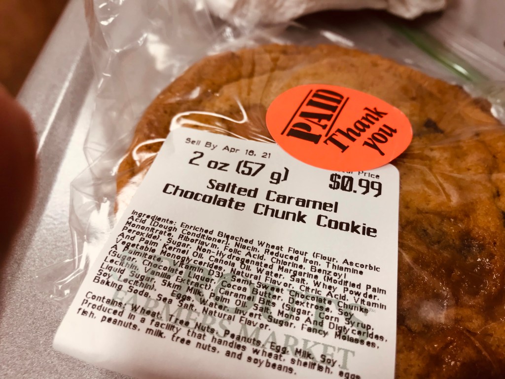 I’m scarfing down a small pb&j sandwich and part of this evil cookie-salted caramel chocolate chip. You don’t have to twist my arm. As soon as I walked into this place today I got a craving. Ninety cents with my discount.