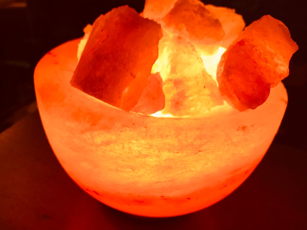 The salt lamps allegedly emit negative ions and help clean the air. I’m not so sure about all that. I mostly just like the peachy orange golden glow.