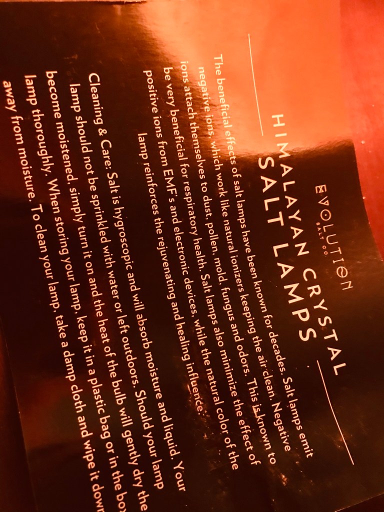 Instead, I’ll just write a little about my new Himalayan crystal salt lamp. Six bucks on the discontinued merchandise shelves at work. I always loved the color.