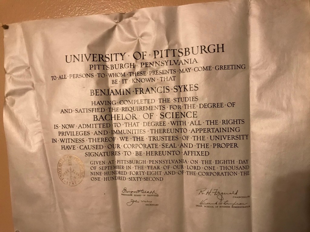 Dad’s BS from University of Pittsburgh awarded to him in 1948. It’s an actual, “sheepskin.” Once upon a time, college diplomas were actually printed on sheepskin. It’s a despicable practice I am very happy to say does not happen anymore.