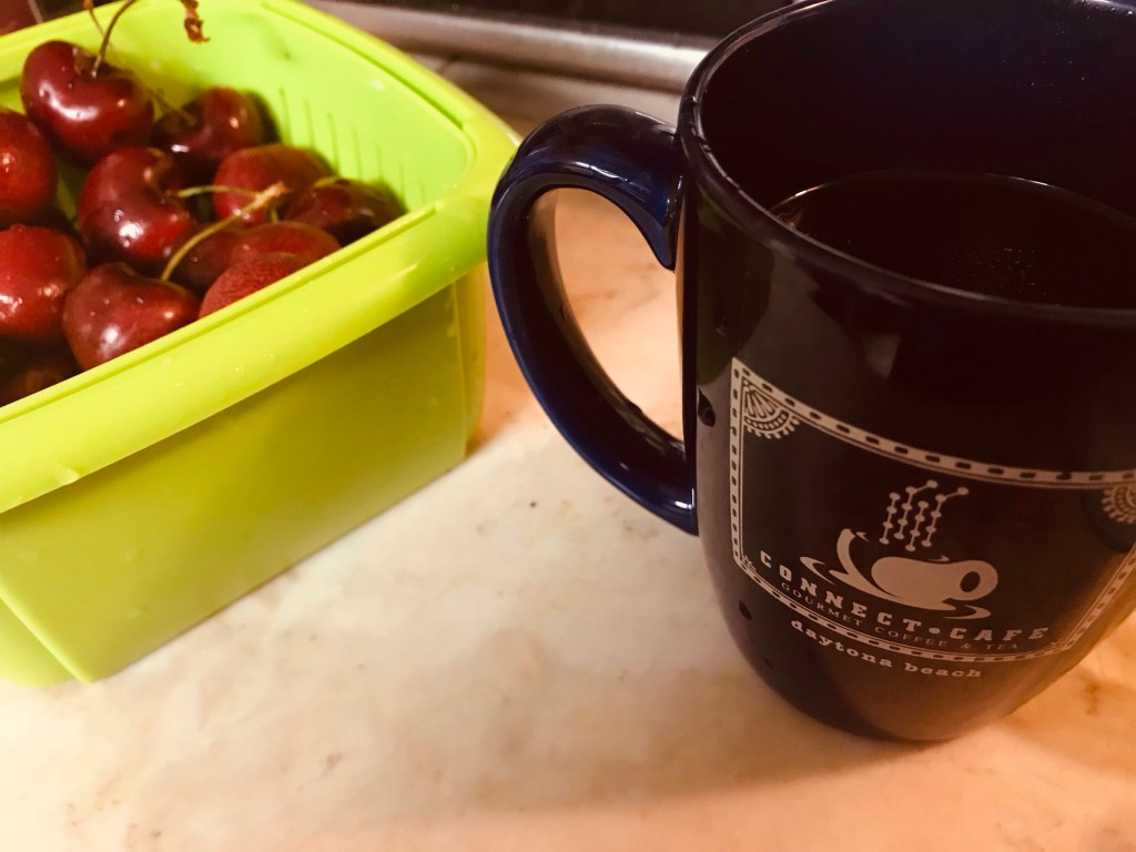 Yay! I’m home. I’m embarking on a new more motivated round o purging and cleaning and organizing. That starts after more cherries and a bagel.