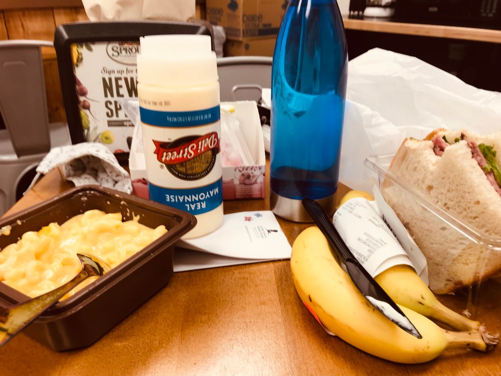 Then I picked out a cold sandwich. The cold sandwiches have no condiments on them. You have to ask for a cup from a deli clerk. I went to get Mayo and the deli manager said, “You know what…“ “Put these in the breakroom?” “Yes, here’s some mustard too.” Now, we are polluting less. I like that.