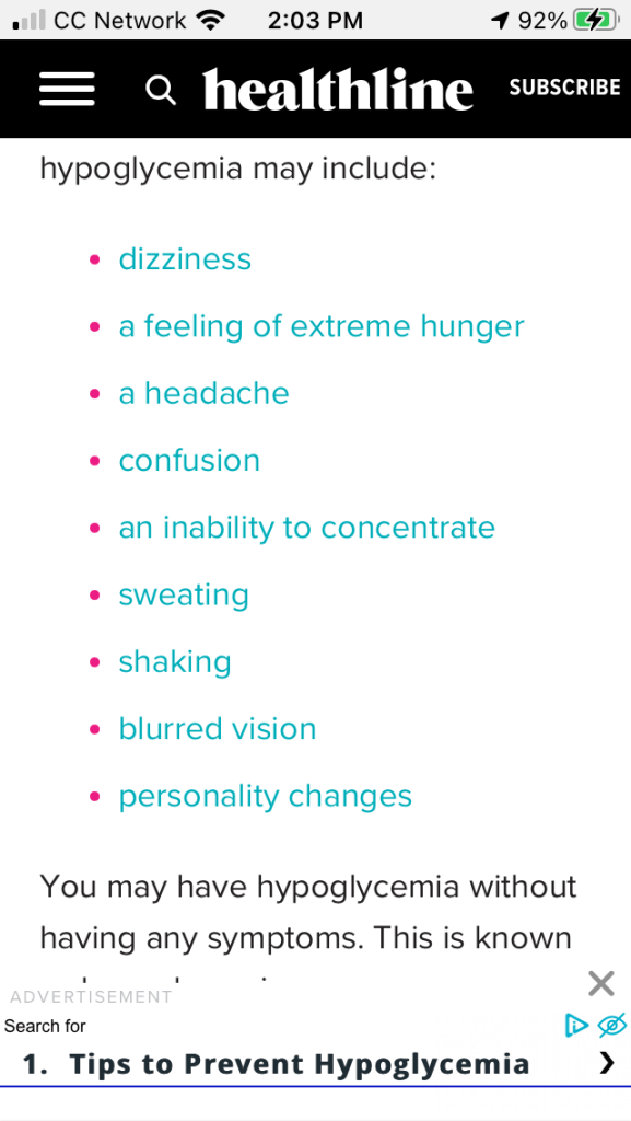 I did find an article on WebMed, a site I’ve always found reputable, that was emphatic about hypoglycemia being related to diabetes, as in you have to have diabetes to have hypoglycemia, that or you have a tumor on your pancreas, which is rare.