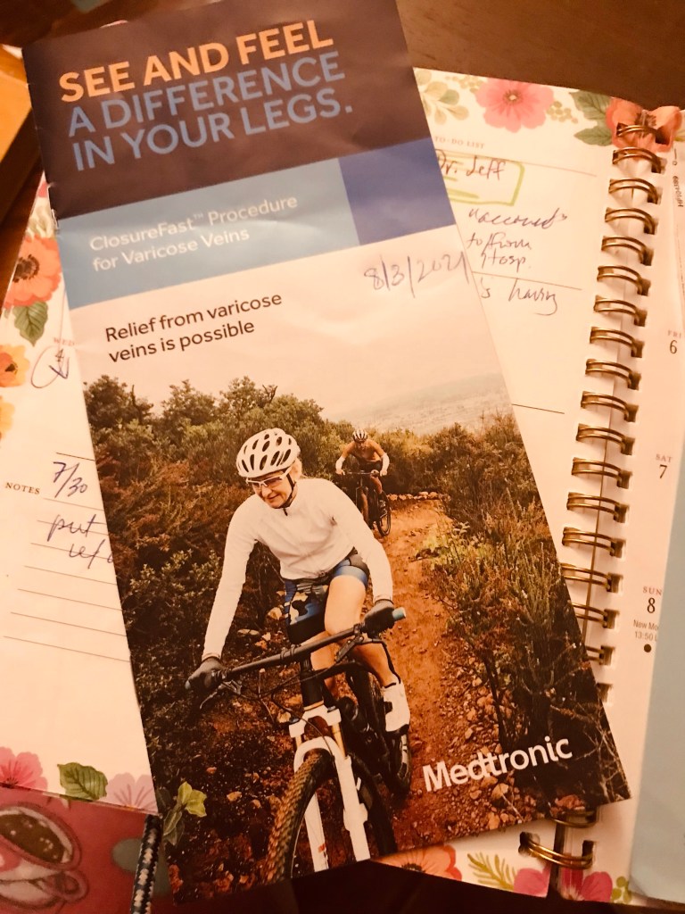 He also said, “I’ll do whatever you want,” meaning that I was asymptomatic, so it’s ok to just monitor it for awhile. He asked me if I was going to have my right knee replaced anytime soon. “Well, I know it’s going to need to be done, but I’m thinking December or January.” He told me it would be a good idea to have the venous ablation done before the knee replacement because it would actually make the orthopedist’s job a little easier. We settled on returning in four months, but when I got to the receptionist, I’d decided that November was probably better.
