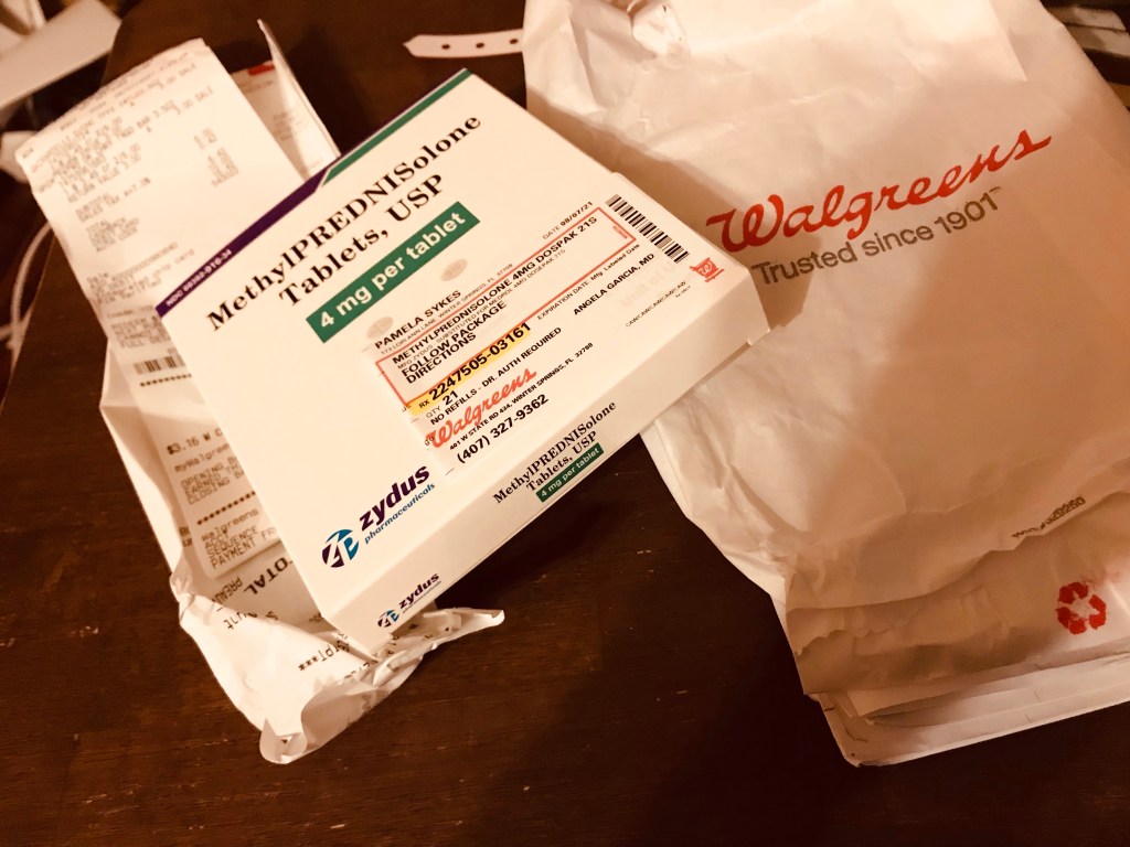 If Walgreens wasn’t on the corner right near my house, I’d be screwed. The ER doctor gave me three prescriptions. The one in the photo is a steroid. It’s too late to start it today. Steroids always have whacky instructions. They start you off with about 6 pills at specific intervals and you get gradually weaned off them. I was supposed to take two before breakfast. Fat chance, now, it’s 5:08 pm.