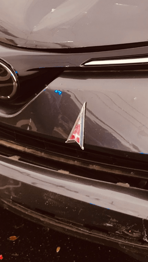 See that elongated red triangle on the front of the Toyota Rav 4? That’s the Pontiac badge from the rear end of my car. Why is it face up since the Toyota rammed my car? Physics is phunny.