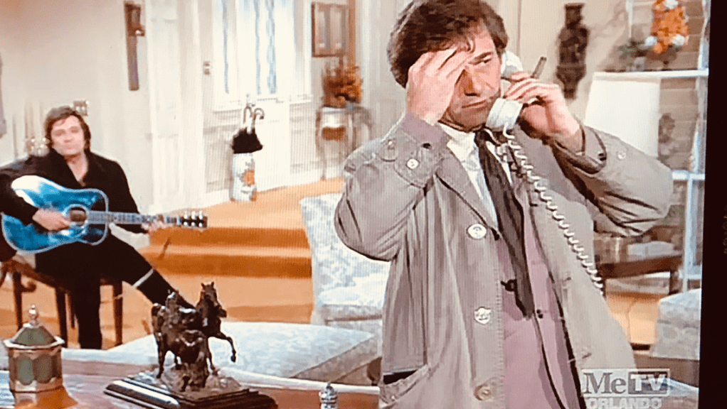 We’re watching, “Columbo.” I know, it’s such a shock. It’s a goodie. Johnny Cash is playing the villain. He bumped off his obnoxious wife-I really can’t blame him. She was a bitch-and his young sister.