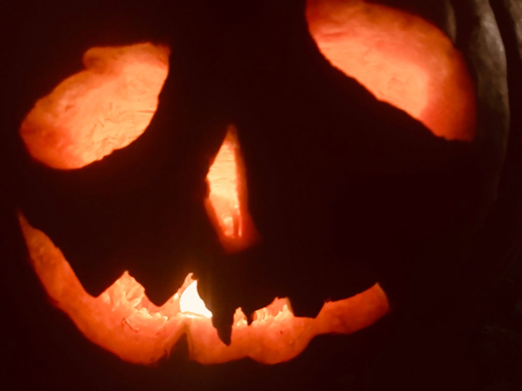Jack didn’t turn out exactly as I wanted. He’s a little rough. My shoulder tendons kept wanting to quit. Oh well, it was still fun. This is the first Jack o’ lantern I’ve carved since I moved into my present domicile.