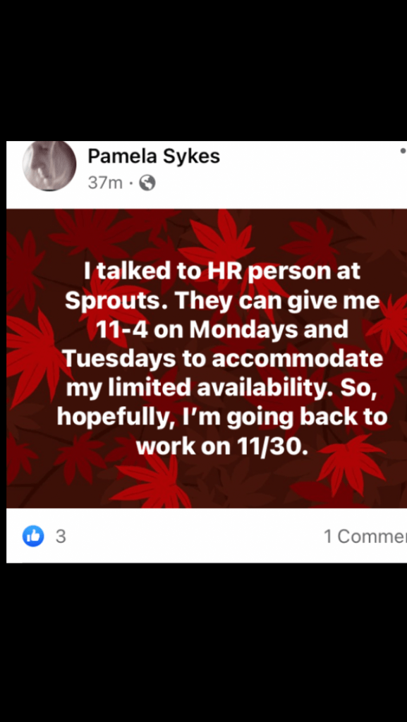 Calling them was on my to do list for today. But, since Betty (not her real name), the woman who handles most HR issues in my Sprouts store in Winter Park, called and left me a message about wanting to put me back on the schedule on 11/30, I decided to ignore Unum for today.