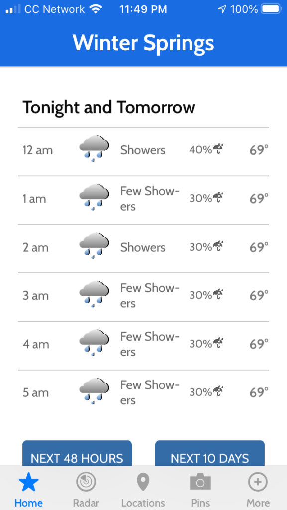 Alas, this is tonight’s weather prediction for the Orlando area. This is a screenshot from the WKMG weather app.