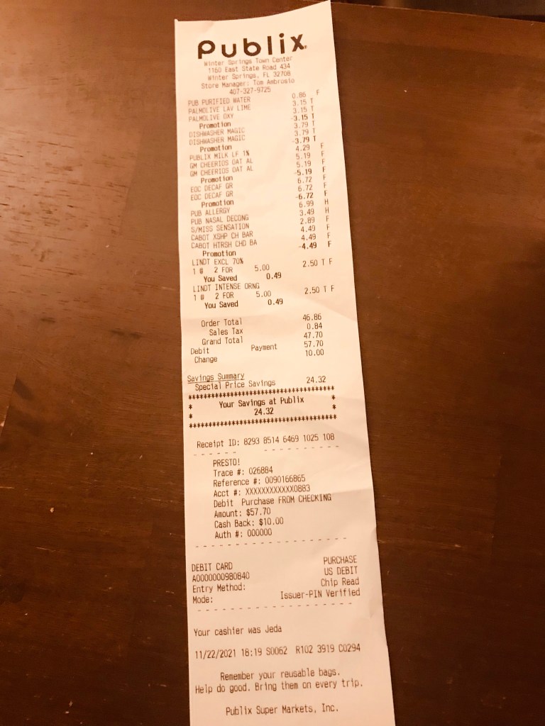 Also not on sale, but I bought anyway were my allergy meds. The Publix decongestant has been missing in action the last few times I’ve been in Publix. It’s the same story at Walmart with their store brand. I got it and a bottle of Publix anti-histamine because I’ll probably have to wait for a cargo container to get unloaded in LA the next time I need them.