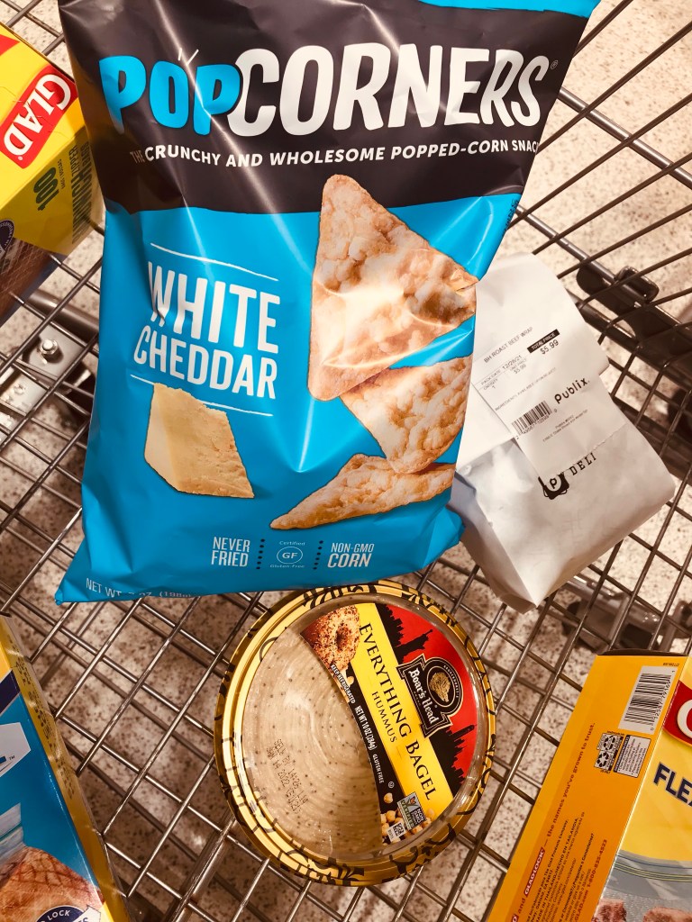 My trip home from work took me and the roomies to Publix (I know, stunning!) where I got a Boar’s Head wrap and Boar’s Head hummus that was on sale at half price. Oh twist my arm, and again, for the Pop Corners chips.
