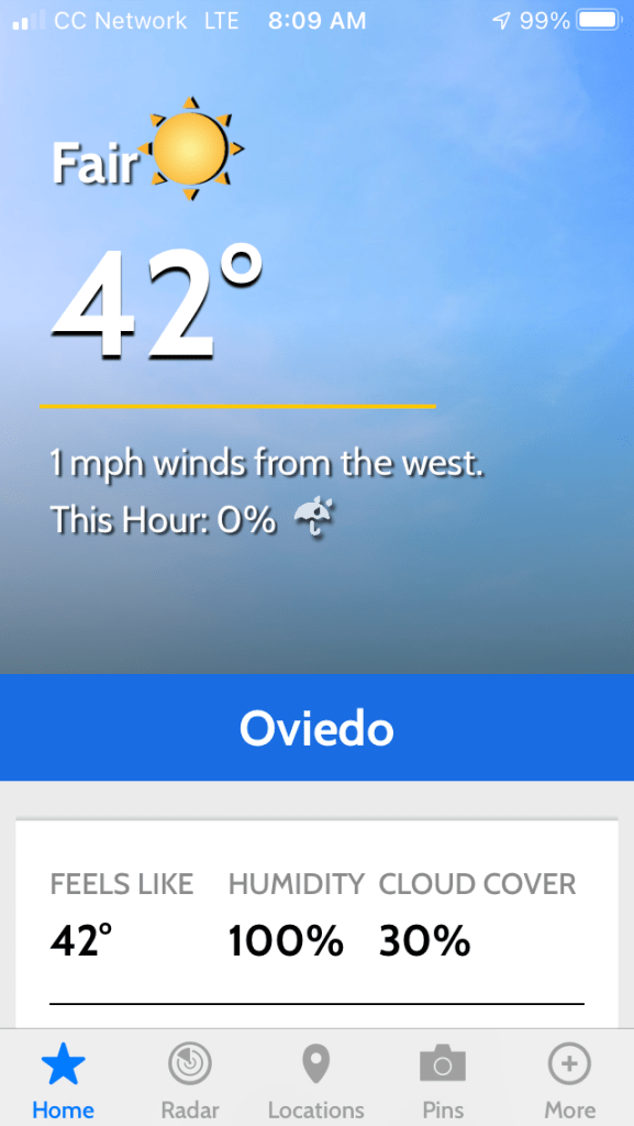 It’s 8:11 am. I wish I could say I was in Oviedo, Spain, but alas, Vickie is driving me to work in Winter Park.