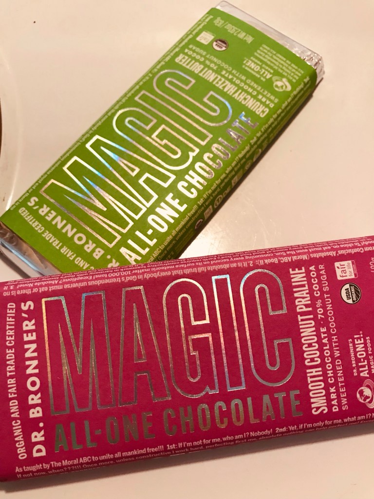 Another of my work highlights today was ringing up couple who looked to be about my age-high 50’s, low 60’s. They were getting about ten items-all produce. They had their stuff in one of our green shopping baskets and emptied it all on my register belt. “Look at you guys being all healthy with strawberries, blueberries, salad fixin’s making me feel guilty about the BOGO chocolate bars I’m gonna get when my shift ends.” They cracked up. “I’m serious. Dr. Bronner’s chocolate bars. Buy one, get one. I’m on Adkins, but I’m gonna cheat a little,” I clarified. They laughed; they were fun.