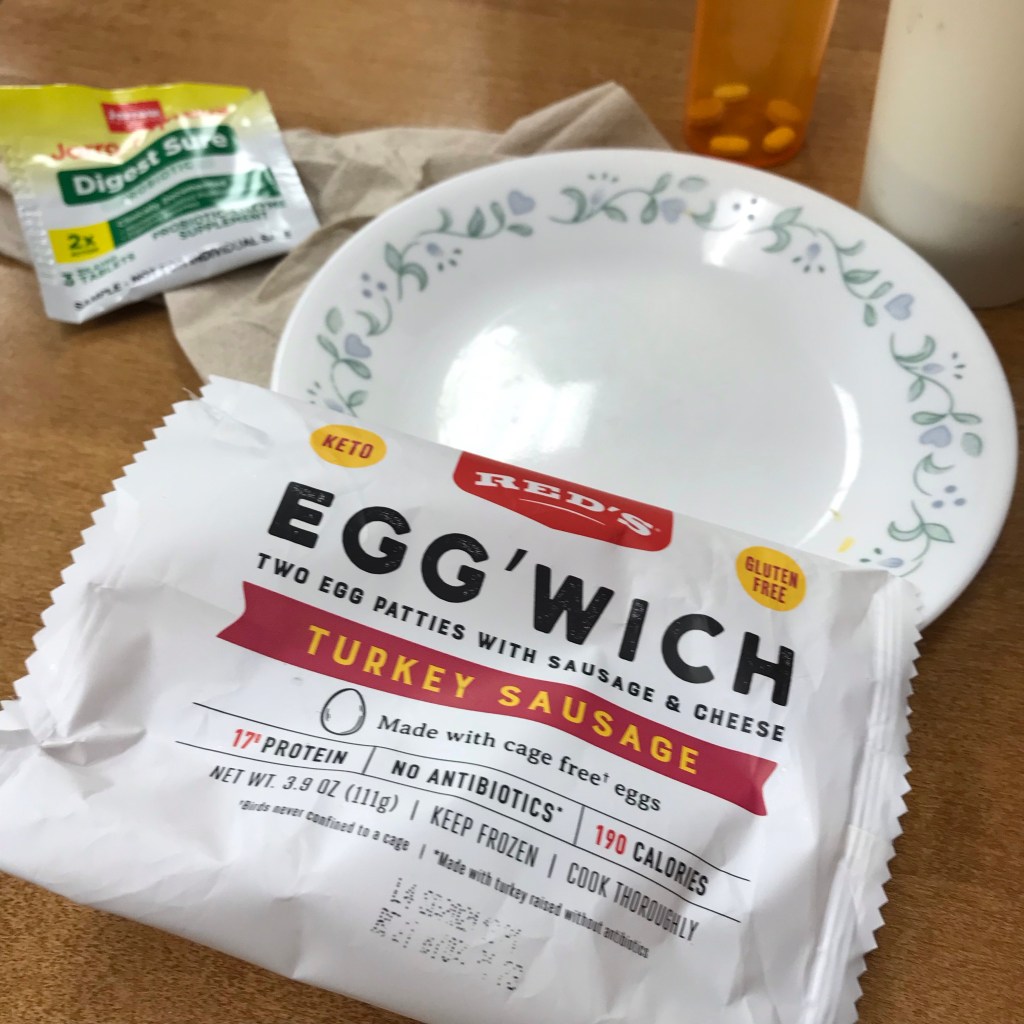 I just ate a breakfast sandwich. It was the first time I ate one of these. I’ve only seen them here at Sprouts. It had no bread. The, “bread,” was the two scrambled egg patties. Thus, it was more Adkins friendly. It was pretty tasty. I also brought my sliced deli chicken and Swiss cheese. I’m about to have some roll-ups.