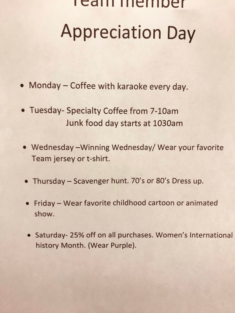 It’s Team Member Appreciation Week. I had no idea. The last time I worked (Monday) there were no signs. Our administrative assistant, who does a lot of the HR work, made us coffee. I shall refer to her as Bella. She’s the main reason I’m here. We worked together at Walmart. I trained her there. My first five minutes with her learning to cashier, I knew she was going places. Sharp lady. Since she got paroled from Walmart and moved to Sprout’s she’s been promoted twice.