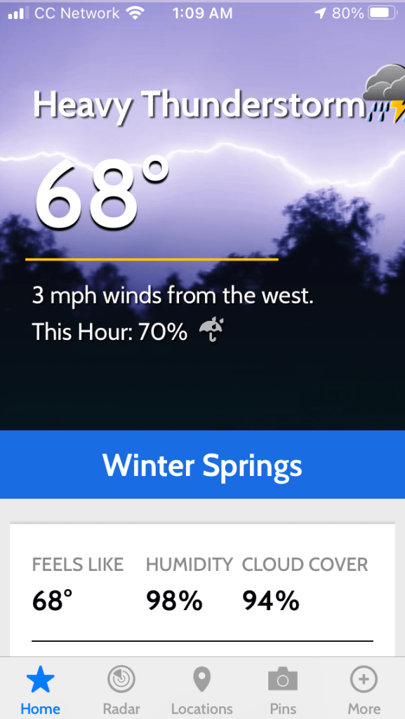 Lots of thunder and lightning. I’m getting ready to go to bed. I love falling asleep to the sound of a Florida thunderstorm.