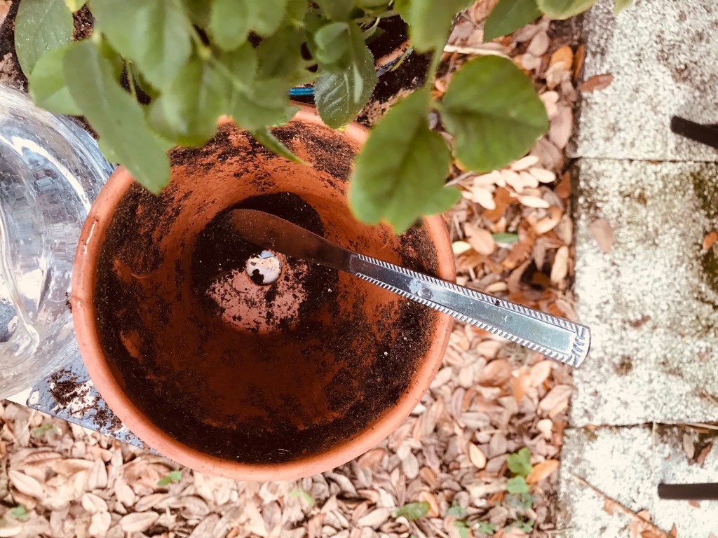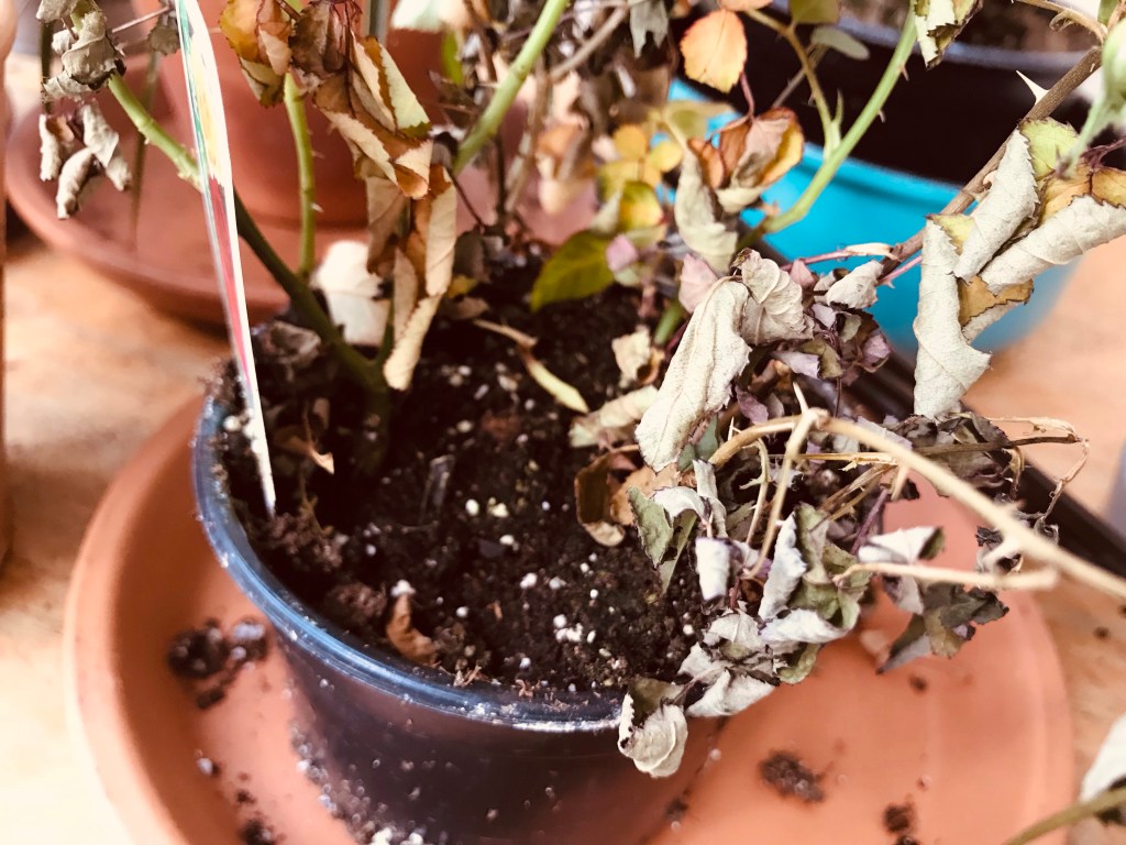 I transplanted three plants: my first mini roses, my sad, newest mini roses, and my kolachoe. After some research, and texts traded with my friend, Pat, I decided to get some neem oil.