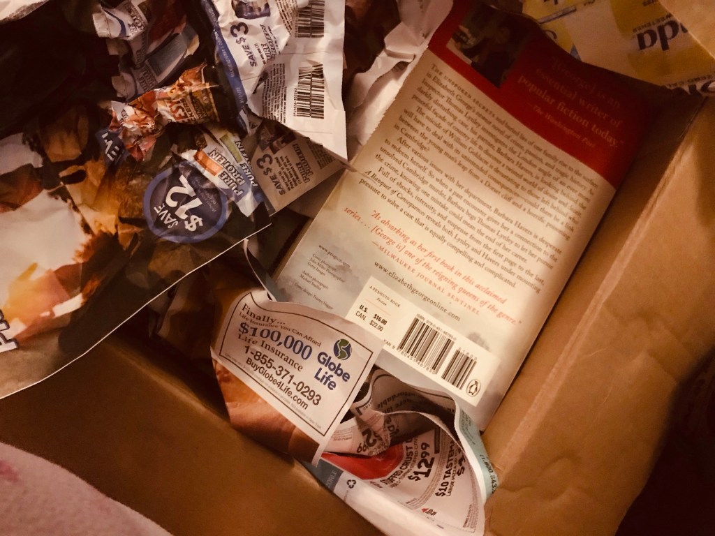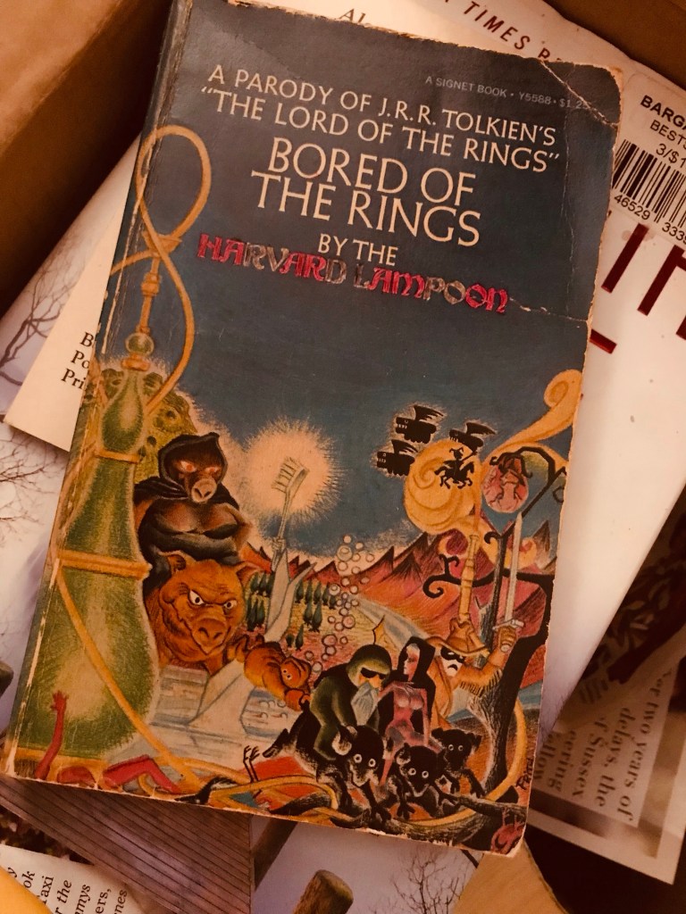 It’s overcast here today.This is really a color photo.Bo, not entirely giving up on the sun.Daisy, from next door. She’s crushing on Bo.Lizard lounging on some recycling material.Looks like it’s tail is growing back.Box of books. Packing up books: mostly novels I know I will re-read, such as, “Confederacy of Dunces,” and some anthropology and sociology books.Yep, I’ve had this exact book since high school. It’s hilarious. “Will thee kiss me in the dark, baby?”