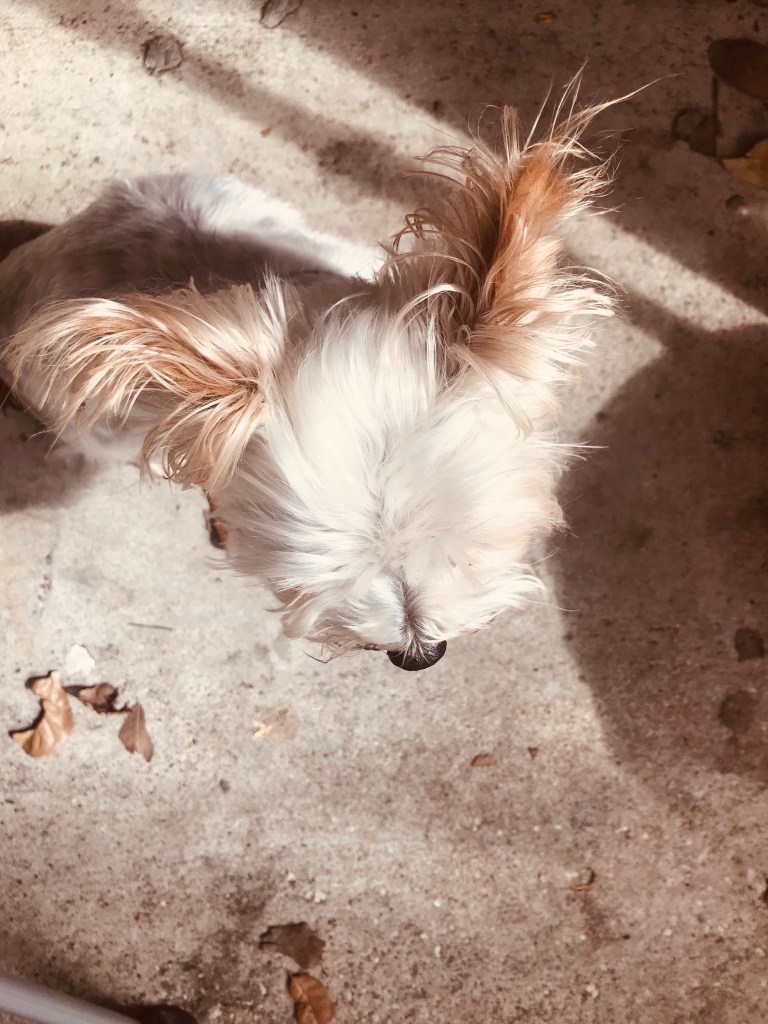 I’m outside with Bo—even though it’s lightly sprinkling in the sunshine. I didn’t want him inside while the floor is wet.