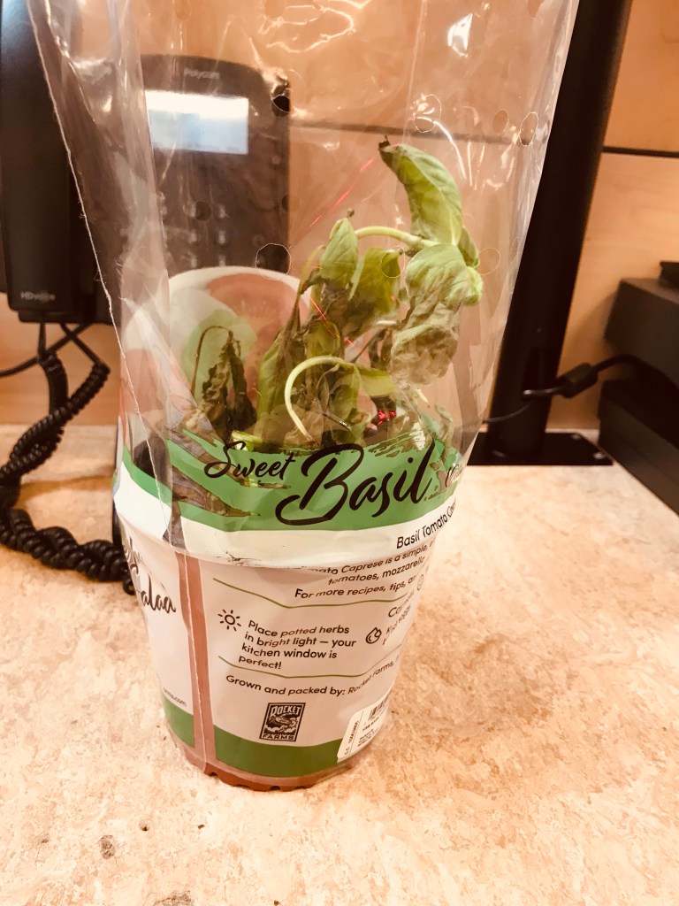 The whole stem is brown now. But, I think I’m going to buy a thriving one at work. They are only $1.99. Plus, I’ll get 15% off. I love both the taste and smell of basil. We sell ton of these at Sprouts.