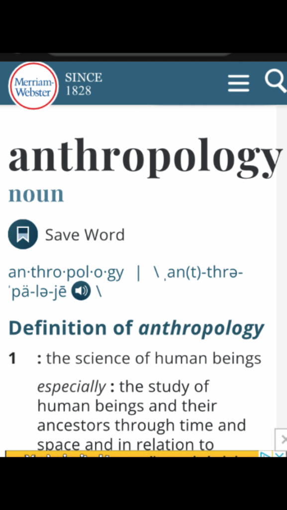 I looked in vain for a succinct definition of, “anthropology,” among my numerous textbooks, but they all had these lengthy descriptions of this fascinating social science. Thus, I resorted to screenshots from the online Mercian-Webster Dictionary.