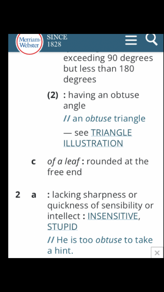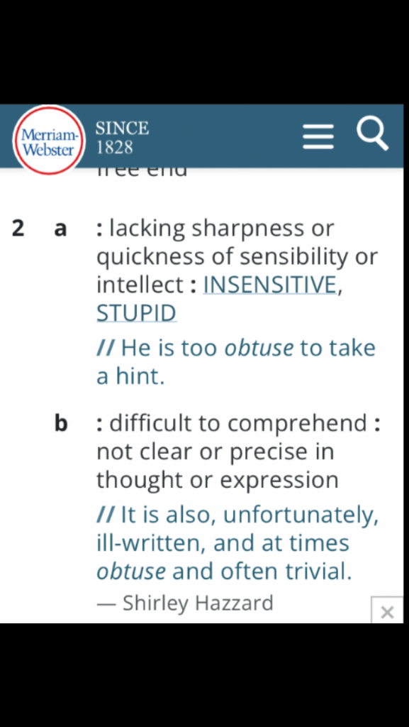 July 22, 2022 Word of the day 14 O B T U S E In a sentence: I hate it when people make me read between the lines; why be obtuse when they can be direct? I disagree. If you really care about someone, you try to communicate in a direct manner. Share this: Click to share on X (Opens in new window) X Click to share on Facebook (Opens in new window) Facebook Like Loading...